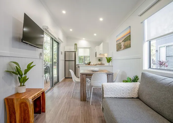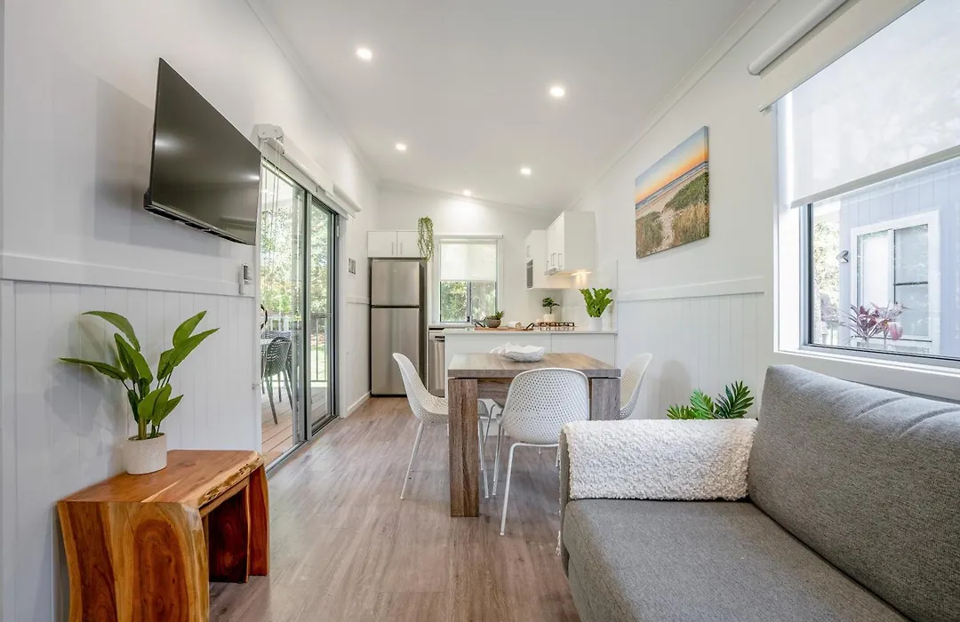 Accommodations at Big4 Tasman Holiday Parks - Nambucca Heads include elevated surf villas, poolside huts, and the unique bathing boxes. Room types are designed for families with options such as two bedrooms, equipped kitchens, and air conditioning. Some units feature modern amenities like a Smart TV and outdoor settings.