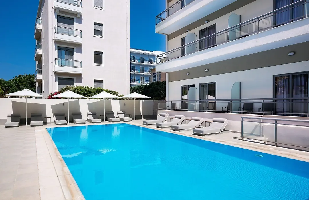 Leisure facilities feature an outdoor pool surrounded by deckchairs for sunbathing. Visitors can also explore local attractions such as the Medieval City and the Acropolis of Rhodes, both easily accessible on foot.