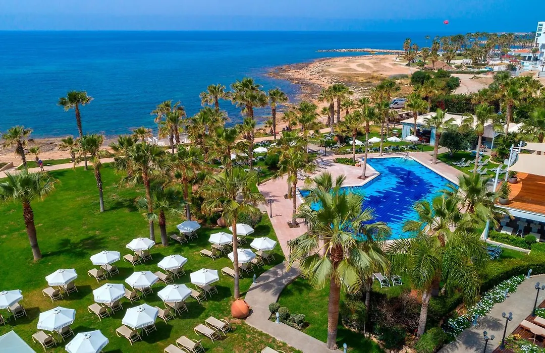 Aquamare Beach Hotel & Spa, a 4-star Geroskipou hotel rated at 8.4/10 on Booking.com, features a beachfront location with a free-form pool, hot tub, and children's pool, surrounded by a palm-tree garden. This spa hotel is distinguished for its authentic L'Aqua Spa, the only one of its kind in the Paphos area.