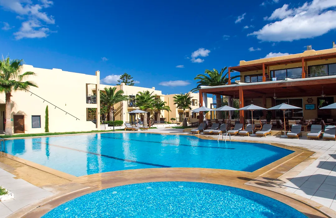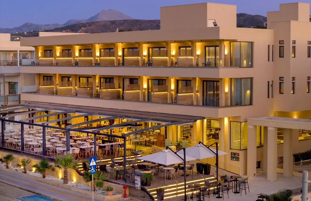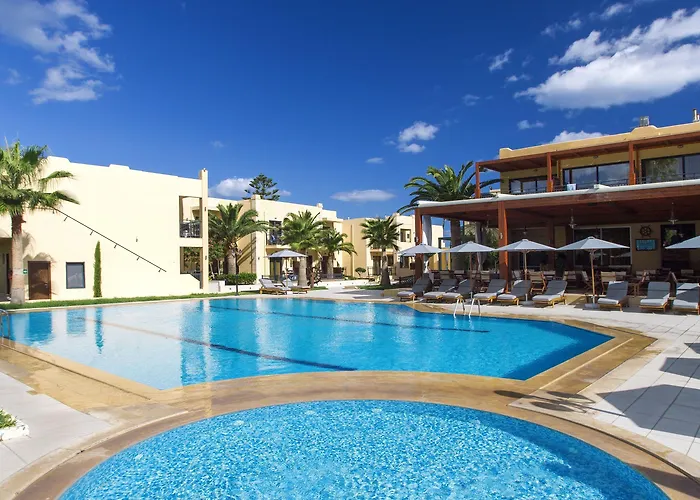 Atlantis Beach Hotel, a 5-star resort in Rethymno, offers direct access to a Blue Flag sandy beach and a comprehensive array of amenities including a spa and two outdoor pools. The hotel spans 3 hectares, featuring a main building and several smaller accommodations surrounded by gardens.