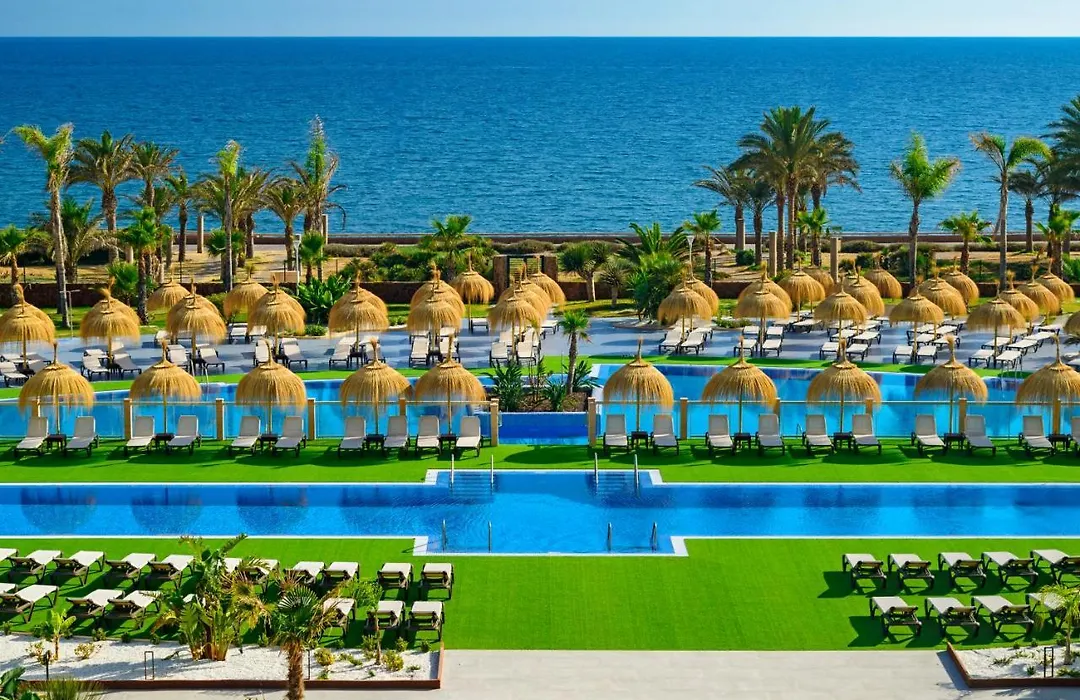 Dining options include a buffet restaurant serving Mediterranean cuisine made with fresh local ingredients and specialty bars for snacks and refreshments. Guests can enjoy meals with views of the pool or beachfront, enhancing their dining experience.