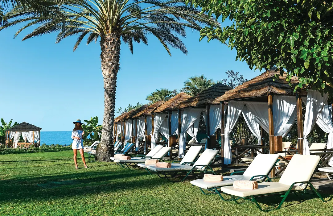 The hotel features 208 elegantly designed guest rooms, including options like Superior, Superior Deluxe, and Junior Suites. All rooms come with large private balconies offering breathtaking views of the Mediterranean Sea or gardens, along with modern amenities such as air conditioning, flat-screen TVs, and espresso machines.