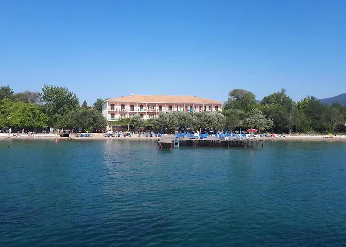 Dassia Beach Hotel, a family-run 2-star hotel with a Booking.com rating of 8.4/10, features a large wooden sundeck with sunbeds and umbrellas directly in front of the hotel. Guests can enjoy air-conditioned rooms with Ionian Sea views from private balconies.