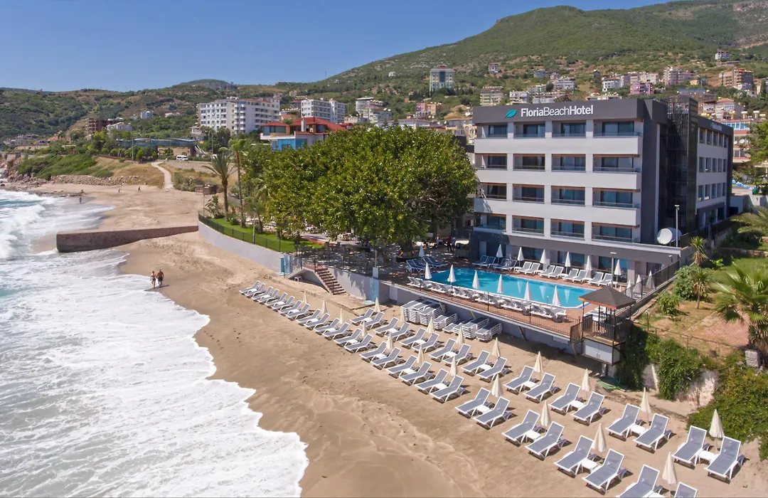 Floria Beach Hotel offers beachfront accommodations on Cleopatra Beach with a modern architecture and unique minimalist decor. This 4-star Alanya hotel rates 8.7/10 on Booking.com and features a private beach area and an outdoor pool.