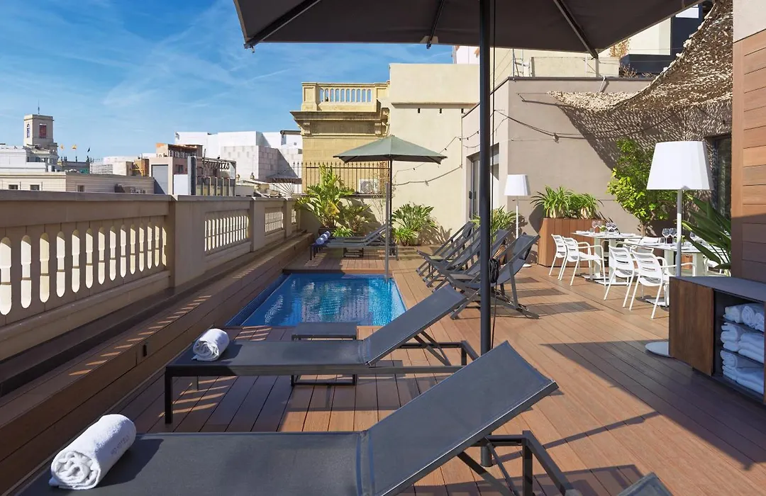 H10 Urquinaona Plaza (Adults Only) is a 4-star Barcelona hotel featuring a blend of modern interior design with preserved Novecentista details, creating an elegant atmosphere. The hotel includes a roof terrace with a plunge pool, a restaurant, and a library lounge.
