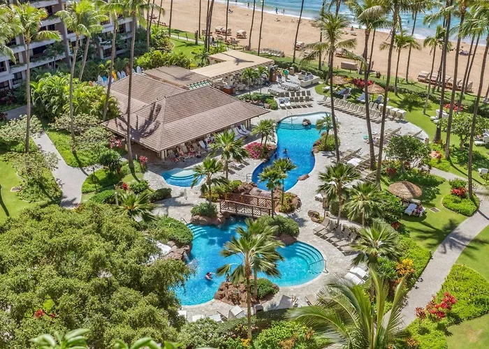 Kaanapali Alii, a 4-star Lahaina hotel with a 9.1/10 Booking.com rating, offers beachfront luxury with spacious one- and two-bedroom vacation rentals featuring fully equipped gourmet kitchens. Guests have access to a 1 hectare super pool with waterfalls and a fitness center, combining hotel services with residential comforts.