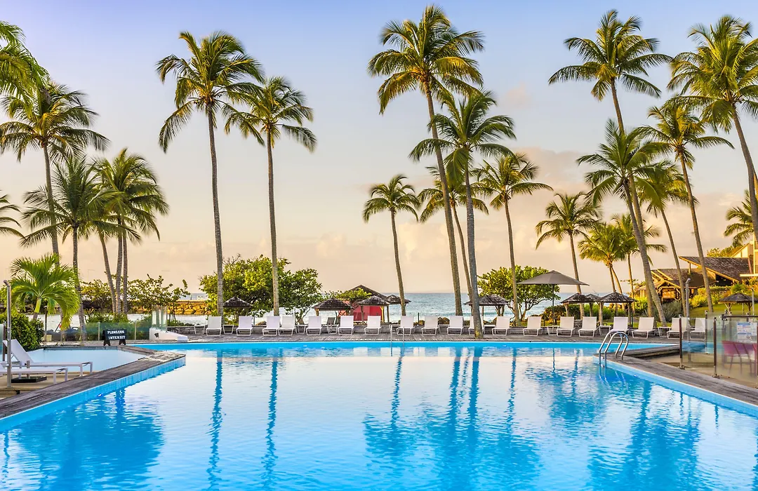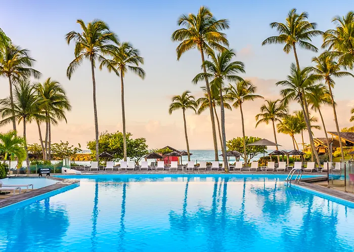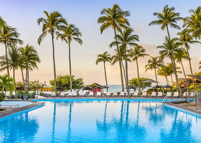 La Creole Beach Hotel & Spa, a 4-star establishment in Le Gosier (Grande-Terre), features a large swimming pool complex set amidst a tropical garden filled with palm trees and hibiscus. The hotel includes a kids' club, spa, and offers multiple dining options, making it suitable for families.