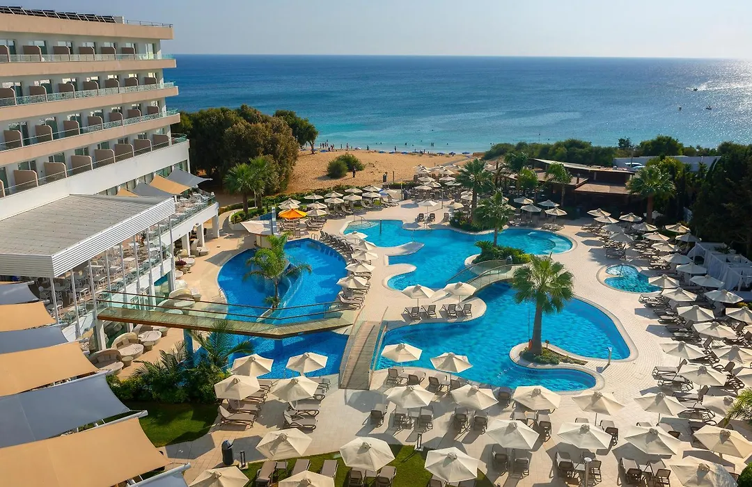 Melissi Beach Hotel & Spa, a 4-star Ayia Napa hotel rated 9.0/10 on Booking.com, offers a large lagoon-style swimming pool and an adults-only pool, making it suitable for families and couples. The hotel features 187 rooms and 38 apartments, a modern spa, fitness center, and multiple dining options.