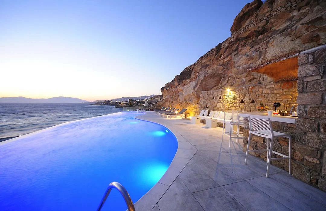 Mykonos Beach Hotel offers a beachfront experience with stunning views of the Aegean Sea from its bungalow-style accommodations. This 3-star Mykonos Town hotel features an infinity pool, jacuzzi, and a convenient location just a 10-minute walk from local shops and nightlife.
