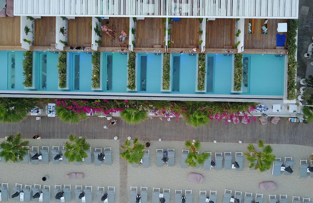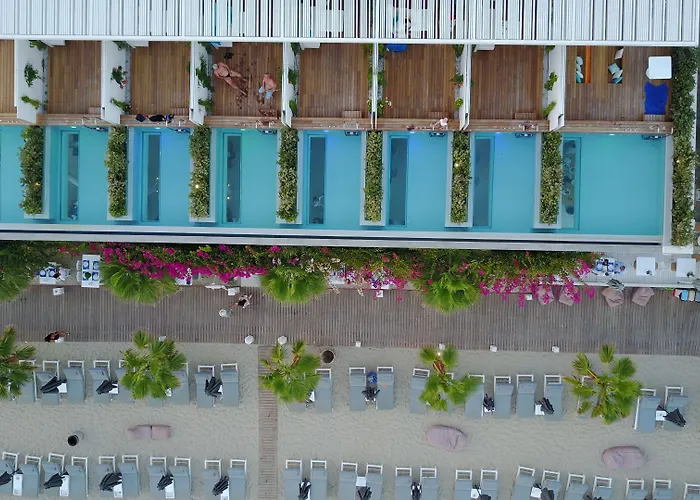 Centrally situated on Platis Gialos beach, Mykonos Dove Beachfront Hotel is a 5-star accommodation offering direct beach access and a range of luxury suites with private pools and stunning sea views. This hotel supports a fully organized beach experience, ensuring seamless relaxation with comfortable sun beds and refreshment service.