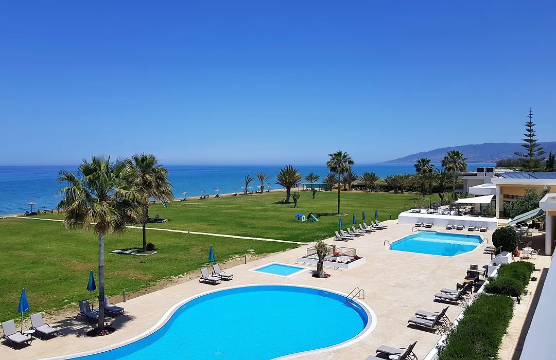 Guests can relax by the outdoor pools surrounded by lush gardens and participate in various recreational activities, including tennis, cycling, and water sports, available at the nearby water sports center. The beach is also a nesting site for turtles, adding a unique ecological attraction. Nature lovers can explore the trails of the nearby Akamas Peninsula Nature Reserve.