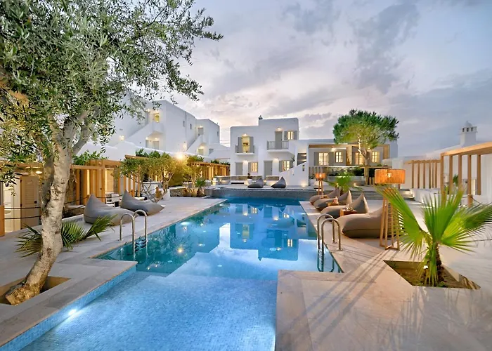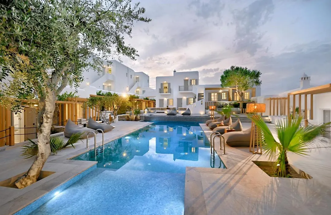 The hotel is conveniently located just 3 km from Mykonos Airport and 5 km from the port, with bus stops only a minute's walk away. Nearby, guests can explore Mykonos Town with its famous windmills, vibrant shops, and bustling nightlife. Popular beaches such as Psarrou and Paradise Beach are also within a short distance.
