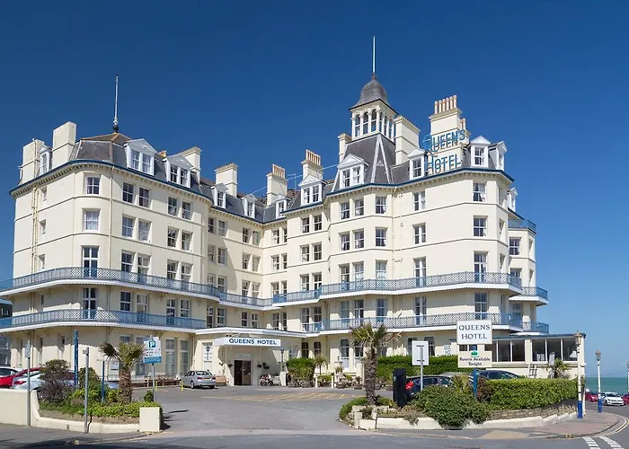 Queens Hotel, a 3-star Eastbourne hotel with a rating of 7.5/10 on Booking.com, is located prominently on the seafront overlooking the pier. This Victorian seaside hotel features a bar offering evening entertainment and extensive parking for guests. The area is known for its charming Victorian architecture and award-winning gardens.
