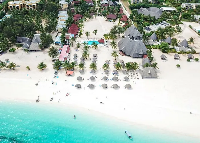 Kendwa Rocks Hotel, a 4-star beachfront hotel with a 7.9/10 rating on Booking.com, features wooden bungalows surrounded by tropical gardens and offers a variety of water sports. Guests have access to a restaurant specializing in Indian Ocean cuisine and a spa with a rooftop terrace.