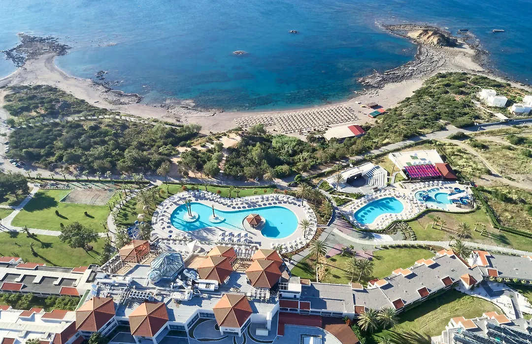 The Rodos Princess Beach Hotel features extensive leisure options including water slides, a Mini Club for children, and a wellness center offering spa treatments, sauna, and hammam. There are also numerous sports activities available as part of the all-inclusive program.