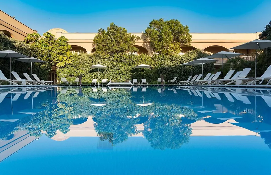 The hotel features a large outdoor swimming pool with hydro-massage jets as its centerpiece. Guests can also explore the surrounding 24 hectares of gardens or utilize the on-site fitness center once open. The property includes function facilities like the Posidonia banqueting hall suitable for both business meetings and celebrations.