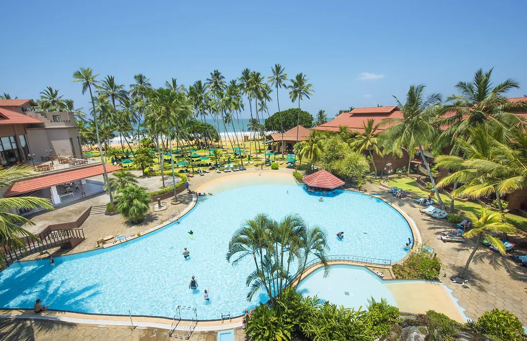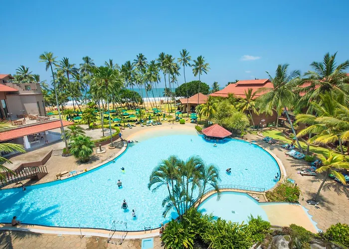Royal Palms Beach Hotel, a 5-star Kalutara hotel with an 8.6/10 rating on Booking.com, features 129 spacious rooms and 7 luxurious suites. The property offers direct beach access, a unique swimming pool with a swim-up bar, and renowned culinary experiences.