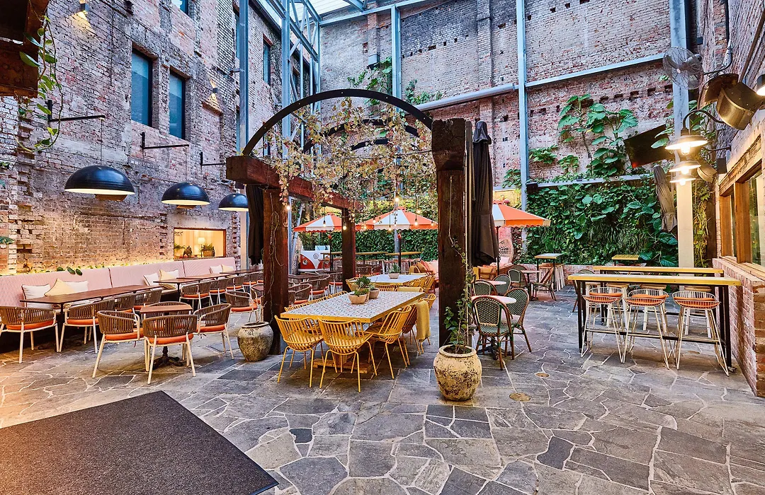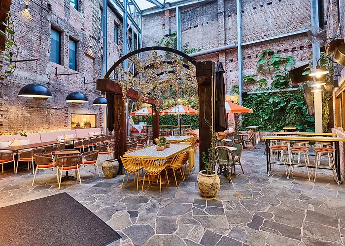 Dining at The Lucky Hotel includes gourmet offerings with an award-winning chef and local wines. Guests can enjoy a kids' menu featuring favorites like a mezze platter. Meals are served in beautifully decorated courtyard spaces, perfect for an outdoor dining experience.