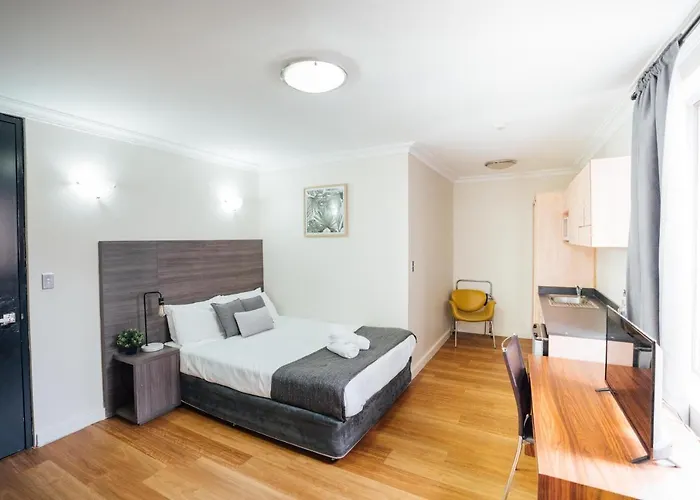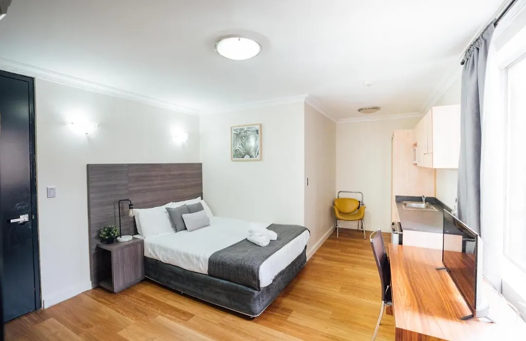 Rooms at Uno Hotel Sydney include Deluxe Rooms and Executive Rooms, each equipped with a kitchenette, flat-screen TV, and free toiletries. The Deluxe Room offers a compact space of 22m² with essential amenities, while the Executive Room provides a larger area of 27m².