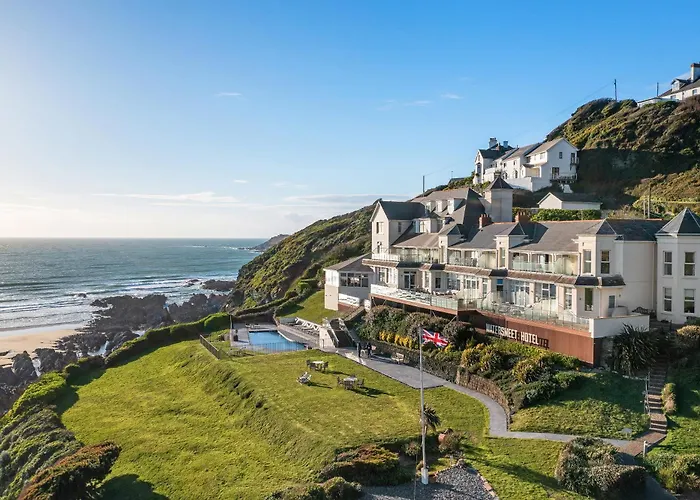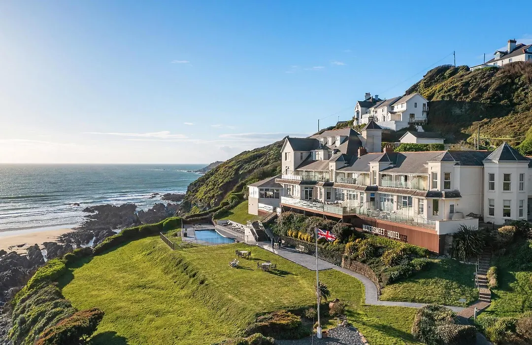 Watersmeet Hotel is a luxury four-star hotel in Woolacombe with spectacular sea views across Woolacombe Bay and direct access to Combesgate Beach. The hotel features an award-winning two-AA rosette restaurant, indoor and outdoor pools, and spa facilities, catering to couples, families, and groups. Its private steps lead down to a secluded beach ideal for rock pooling.