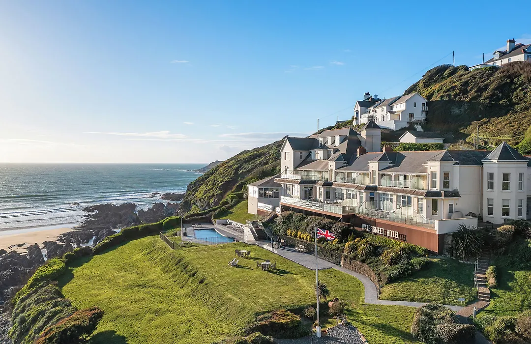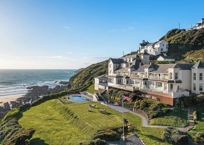 The Watersmeet Hotel, a luxury four-star hotel in Woolacombe, offers stunning sea views across Woolacombe Bay and direct access to Combesgate Beach. This boutique hotel features indoor and outdoor pools, an award-winning two-AA rosette restaurant, and a variety of wellness services.