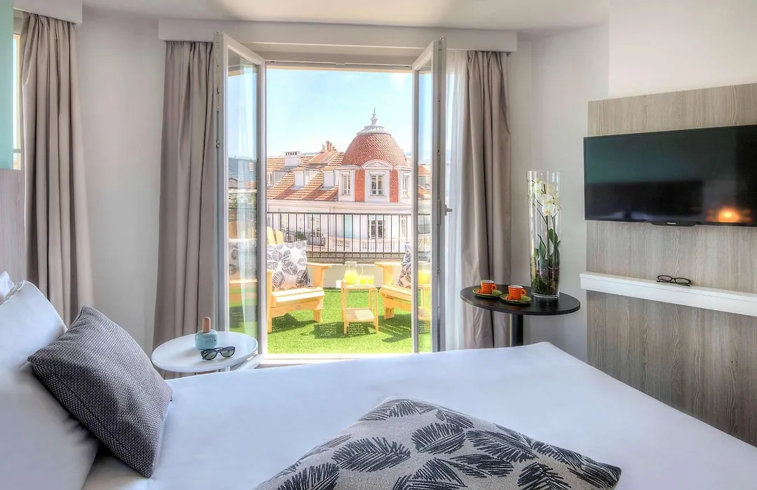 The hotel boasts a prime location near the SNCF station, providing easy access to local transport options, including the tram to the Nice Côte d'Azur Airport. Nearby attractions include Avenue Jean Medecin, Place Masséna, and the Old Town of Nice.