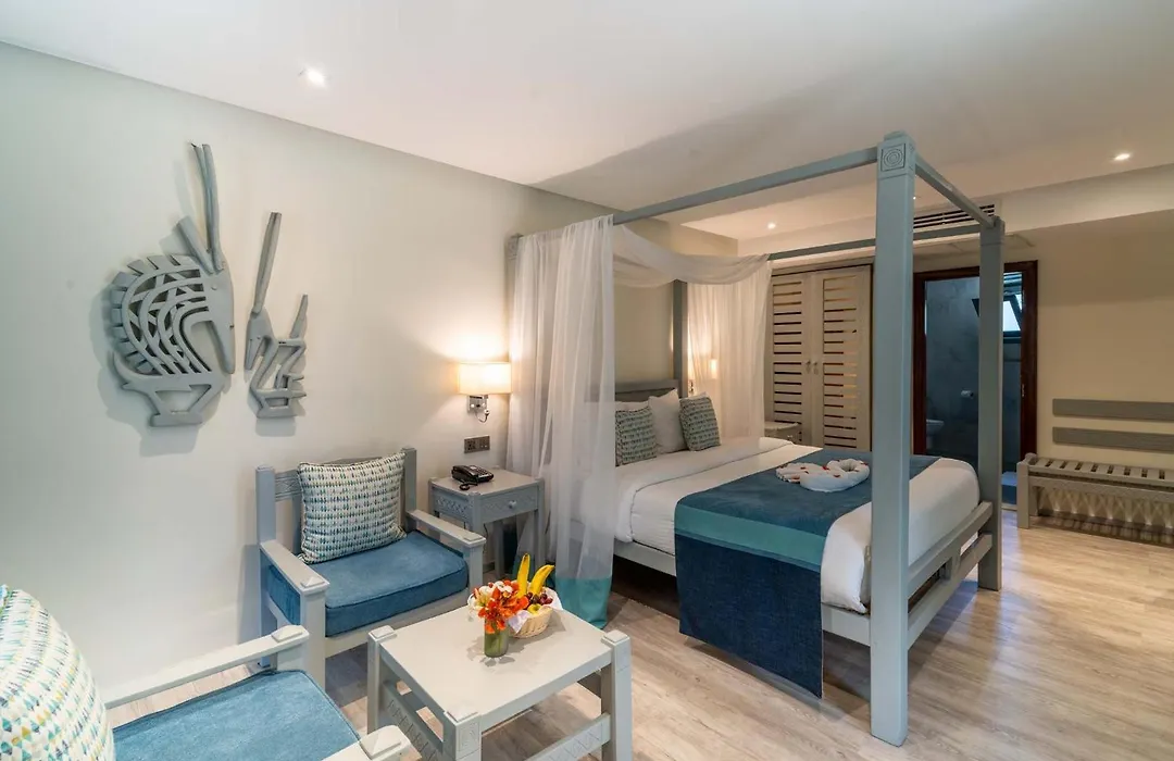 Accommodations at Baobab Beach Resort & Spa are designed for comfort, featuring private terraces or balconies with ocean, pool, or garden views. Options include Garden Rooms, Sea Facing Rooms, and Deluxe Rooms, accommodating families with inter-connecting spaces available.