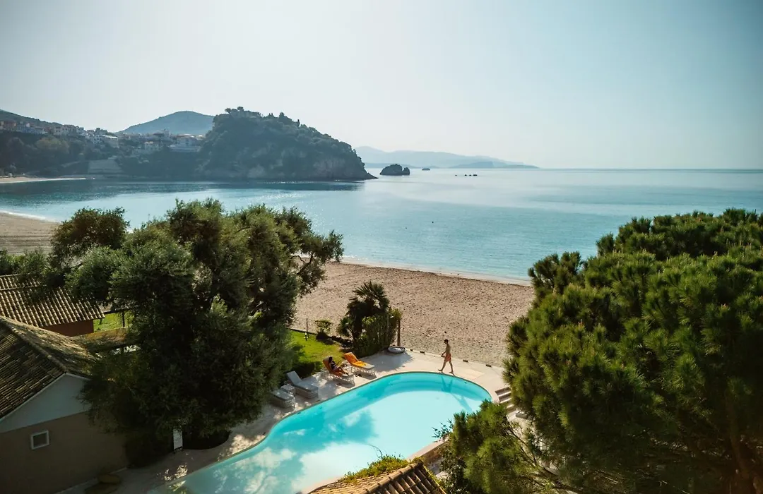 Parga Beach Resort offers a unique 5-star experience on Valtos Beach, featuring over a hundred rooms and suites in bungalow-style buildings surrounded by lush gardens and olive trees. The resort includes extensive amenities such as seven swimming pools, a wellness center, and multiple dining options, catering to couples and families alike.