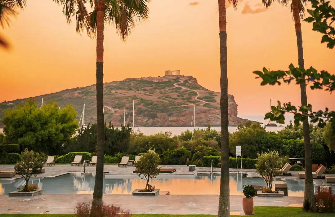Cape Sounio, A Grecotel Resort To Live, is a 5-star luxury destination featuring two private beaches, a seawater pool, and a freshwater pool. The hotel's design reflects ancient Greek architecture, and it offers diverse dining options with views of the Temple of Poseidon.