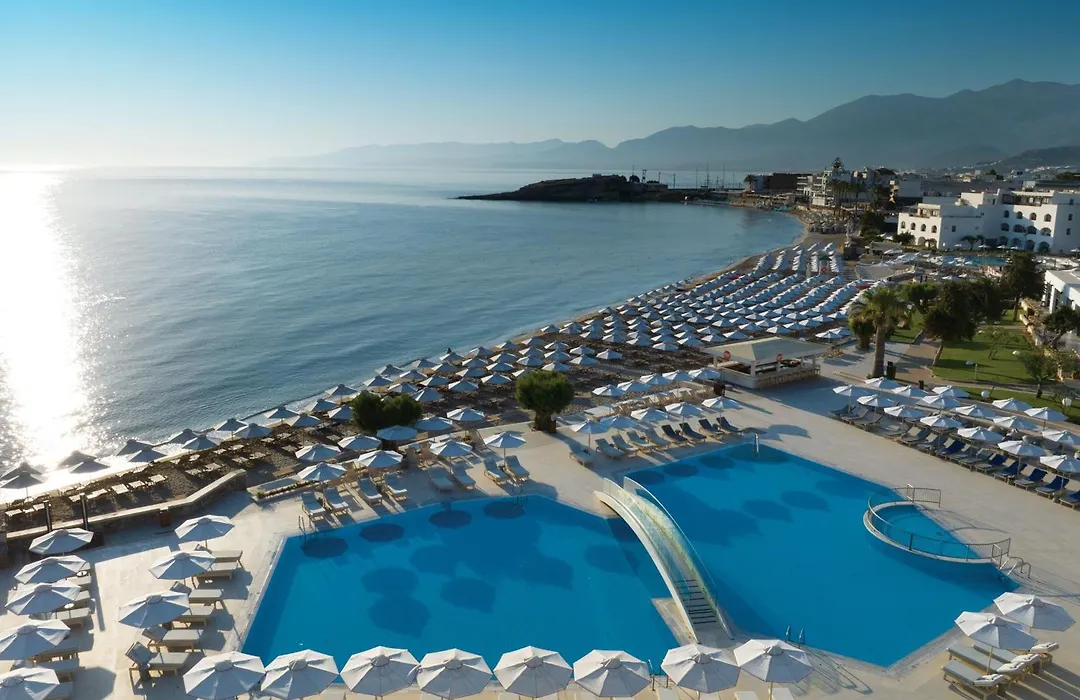Accommodations at Creta Maris Resort include 679 rooms and suites, each with a private terrace or balcony. Guests can select from deluxe pool-front rooms, premium sea view suites, or the exclusive Premium Private Pool Villa for added luxury. Each room offers amenities such as air conditioning and free Wi-Fi.
