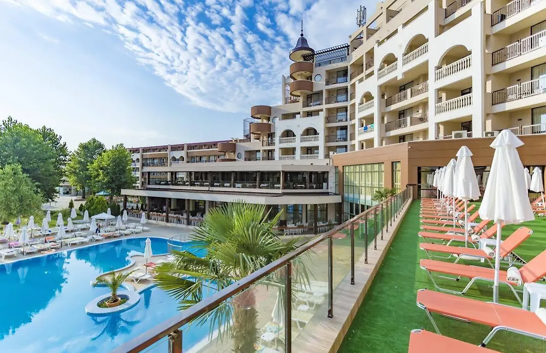 Hi Hotels Imperial Resort features 494 luxury accommodations and a private beach just 100 meters from the sea. This 4-star Sunny Beach hotel offers numerous amenities including three swimming pools, a beach volleyball field, and four restaurants providing a diverse culinary experience. Guests can enjoy all-inclusive services and family-friendly activities throughout their stay.