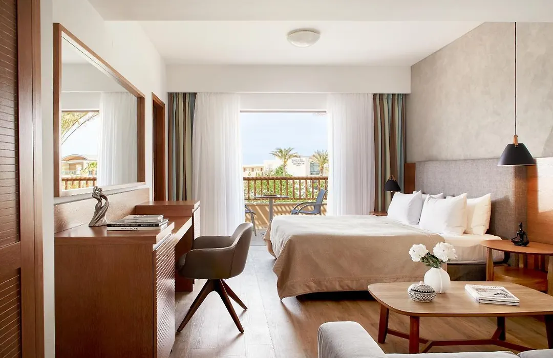 The Minoa Palace Resort offers a range of upscale accommodations including double rooms and bungalows, many featuring private pools. All units come equipped with modern amenities such as air conditioning, Smart TVs, and elegantly furnished balconies.