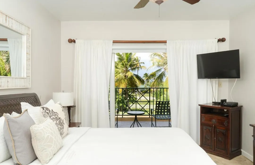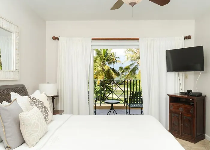 Spacious guest accommodations at Villa Montana Beach Resort include handcrafted furniture and tiles, with options featuring private terraces and fully equipped kitchens. Rooms are designed in the Caribbean Plantation style, providing comfortable living spaces for guests.