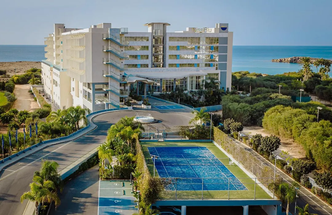 Nissiblu Beach Resort offers 5-star accommodation amidst tropical gardens, featuring a large outdoor pool, children's pool, and indoor heated pool. Located moments away from Nissi Beach, it provides deluxe facilities, smart Superior Rooms, and attentive service.