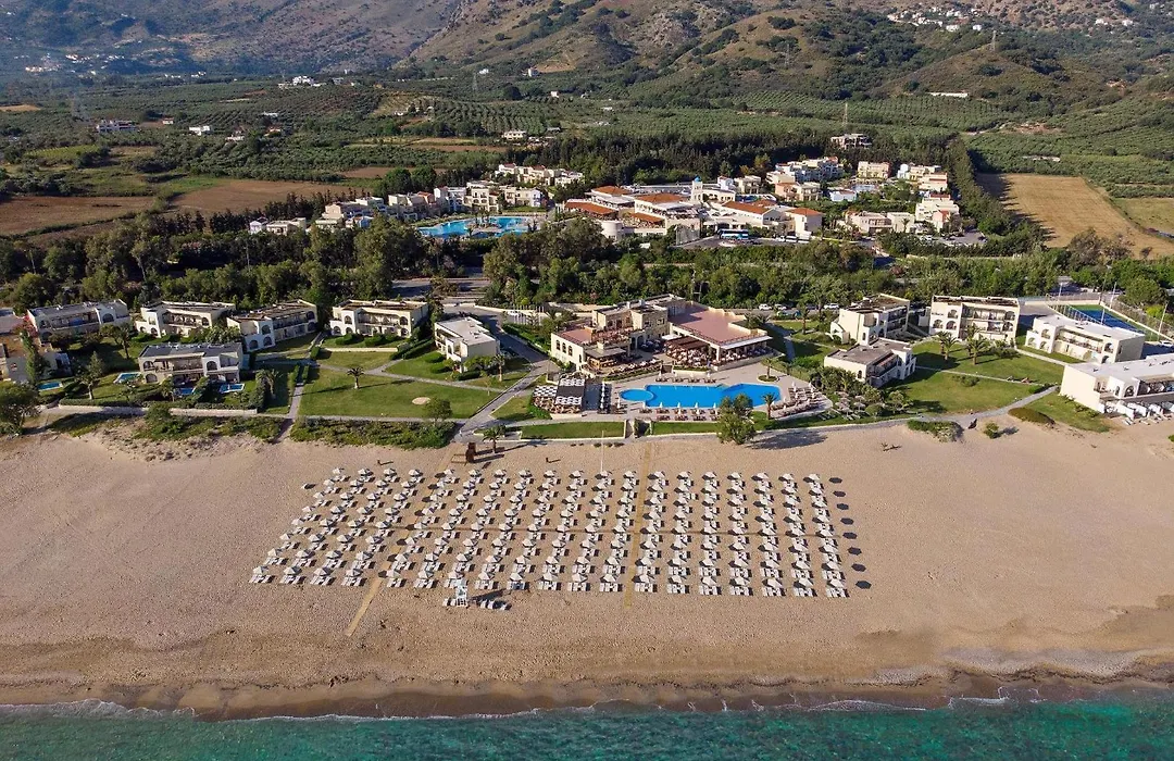 Pilot Beach Resort, a 5-star Georgioupoli hotel, features unique Cretan architecture set among olive and avocado trees by a sandy beach. The resort includes a private beach, five swimming pools, and extensive health and leisure facilities.
