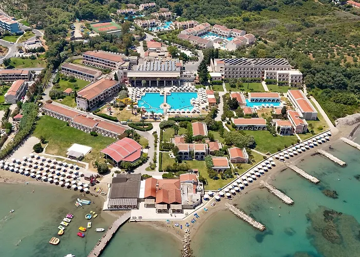Roda Beach Resort & Spa, a 5-star beachfront property, offers an all-inclusive experience featuring six pools, diverse dining options, and a wellness center. This family-friendly hotel is set within a 100000 m² forest estate, providing stunning views of the Ionian Sea.
