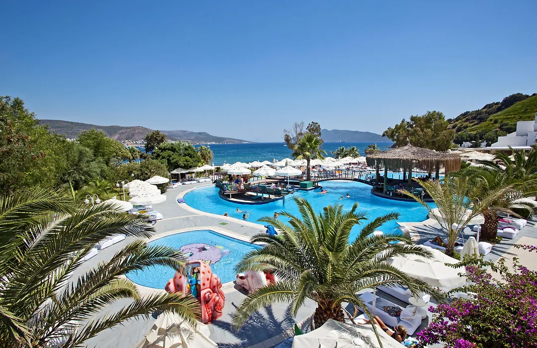 Salmakis Resort & Spa offers a beachfront experience complemented by a large pool complex with panoramic views over Bodrum Bay. This 5-star Bodrum hotel features an extensive spa, ample leisure activities, and dining options.