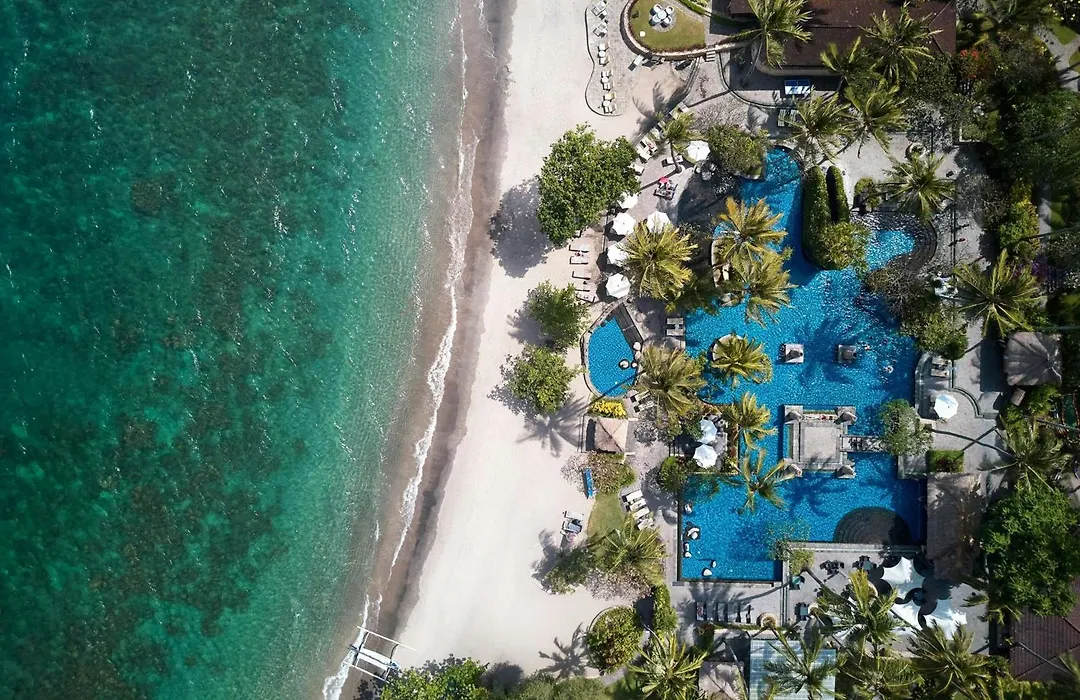 The resort features a beachfront spa offering massages and treatments, alongside a swimming pool with ocean views. Nearby excursions include the Gili Islands, popular for snorkeling and scuba diving, accessible by a short boat ride.