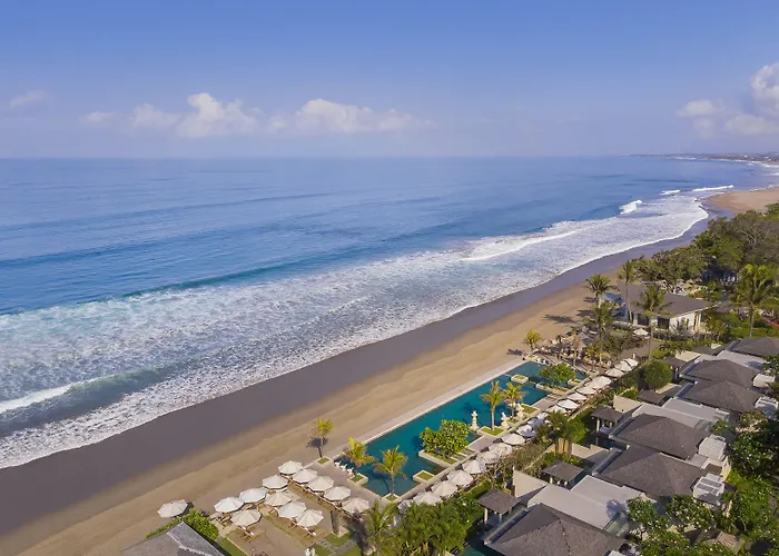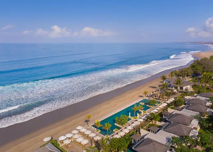 The Seminyak Beach Resort & Spa offers luxury beachfront accommodations with a rating of 9.1/10 on Booking.com. This 5-star spa hotel features an infinity pool, a diverse array of dining options, and a wellness center, ideal for couples and families seeking relaxation.