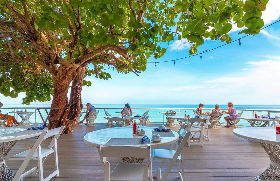 Dining options at Travellers Beach Resort include the Travellers Palm restaurant serving breakfast, lunch, and dinner, featuring Jamaican and international dishes. Guests can enjoy meals with ocean views while also participating in themed events like karaoke and acoustic sessions.