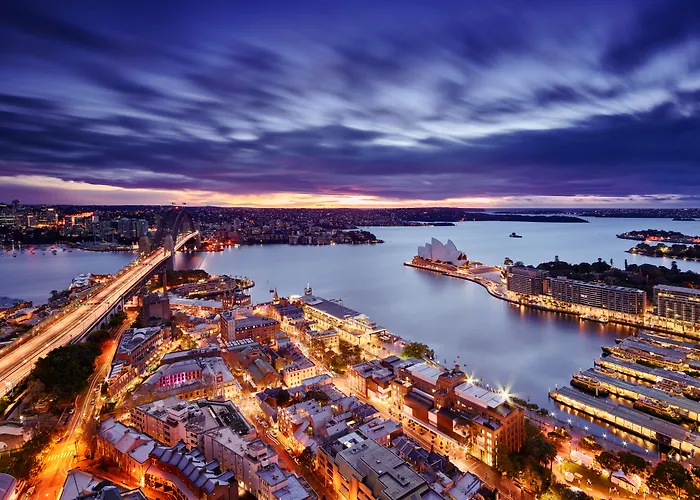 Shangri-La Sydney, a 5-star hotel, offers panoramic views of Sydney's landmarks, including the Opera House and Harbour Bridge. The hotel features a rooftop bar, a full-service spa, and an exclusive lounge for club guests. Its convenient amenities cater to both leisure and business travelers.